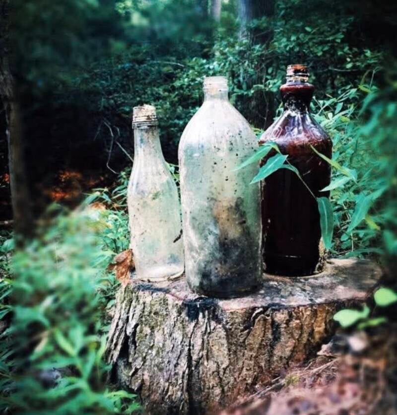 "Now this is different," I think to myself as I stop and look closely at the very old, but unbroken bottles positioned carefully on the top of the stump (see picture). One has the word "Clorox" embossed in raised letters. Where did they come from? Who set them there? When? Why? I continued my run after taking a quick picture.